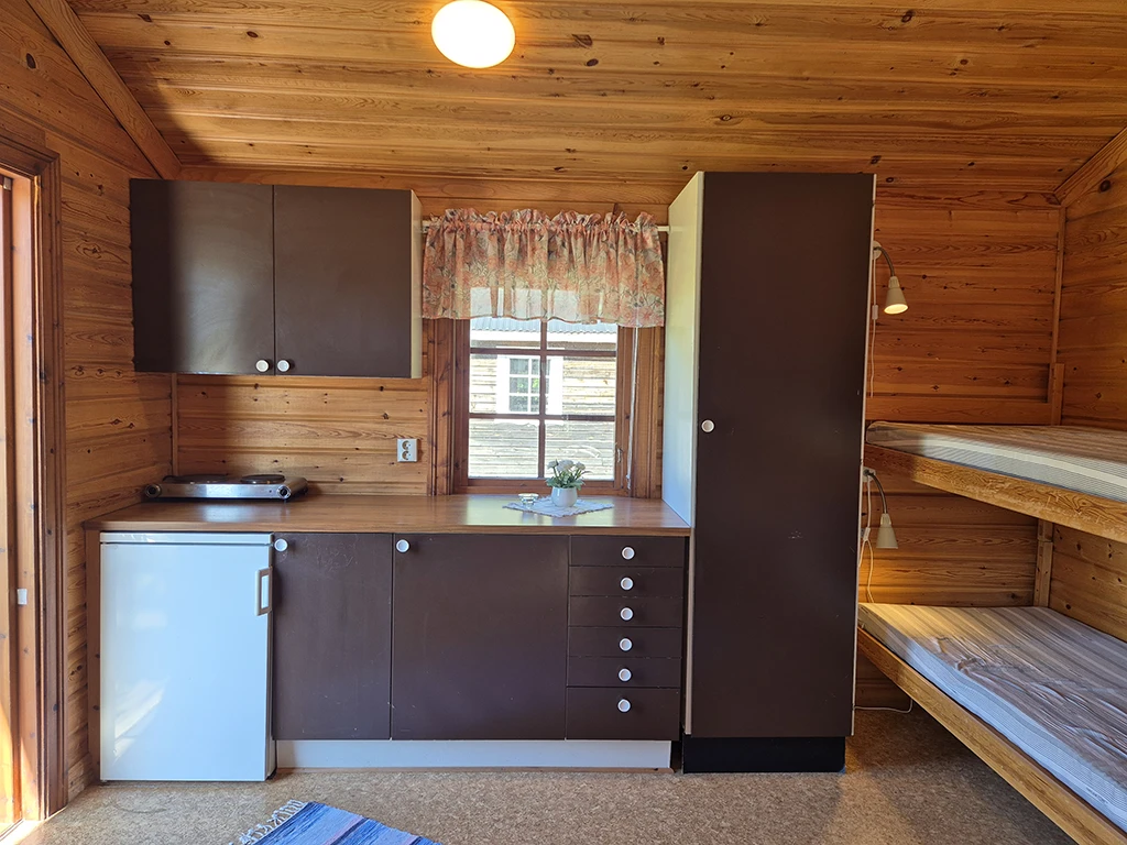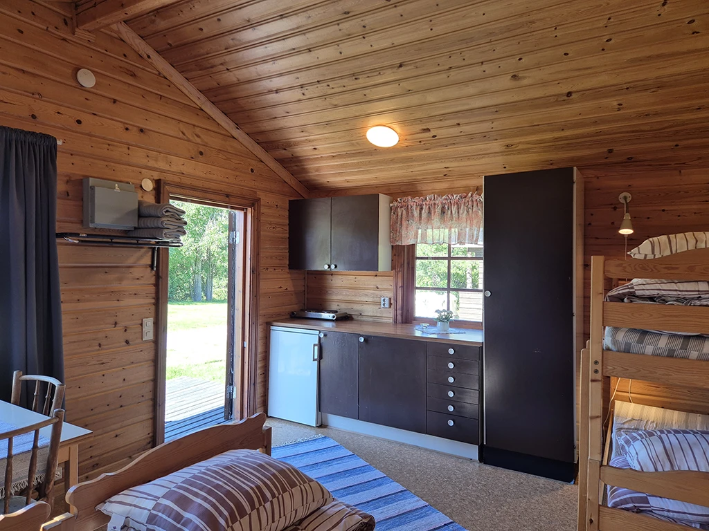 Bo billigt och enkelt på 18 kvm med 2 enkelsängar, 1 våningssäng, kylskåp, bordsspis, enkel köksutrustning. Matbord och stolar. Utemöbler.